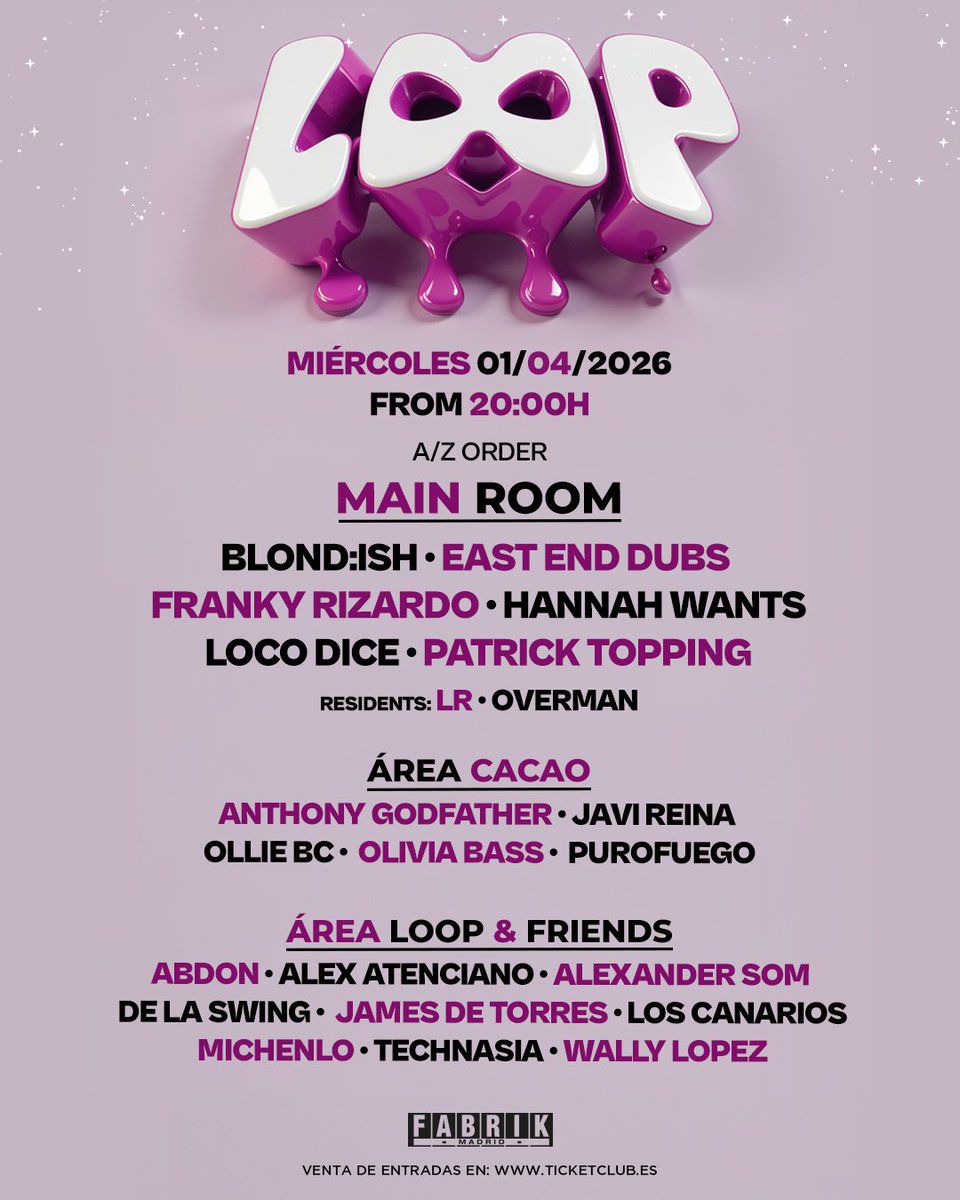 TRAVELFUN te lleva a disfrutar el Miércoles 1 de Abril (víspera de festivo jueves santo) del universo inmersivo de LOOP que vuelve a Fabrik reuniendo a cinco headliners como: East End Dubs, Franky Rizardo, BLOND:ISH o Loco Dice, showcase de CACAO y un montón de artistas nacionales de altísimo nivel¡¡¡Ven con nosotros y viaja tranquilo. Disfruta de la fiesta sin preocupaciones!!!
